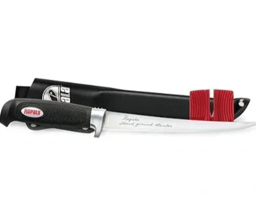 The Soft Grip Fillet Knife features the renowned Rapala flexible stainless steel blade, paired with a non-slip, soft-grip molded handle for ultimate control and comfort while filleting. It comes with a black sheath that easily attaches to your belt and includes a single-stage sharpener to keep your knife performing at its best.